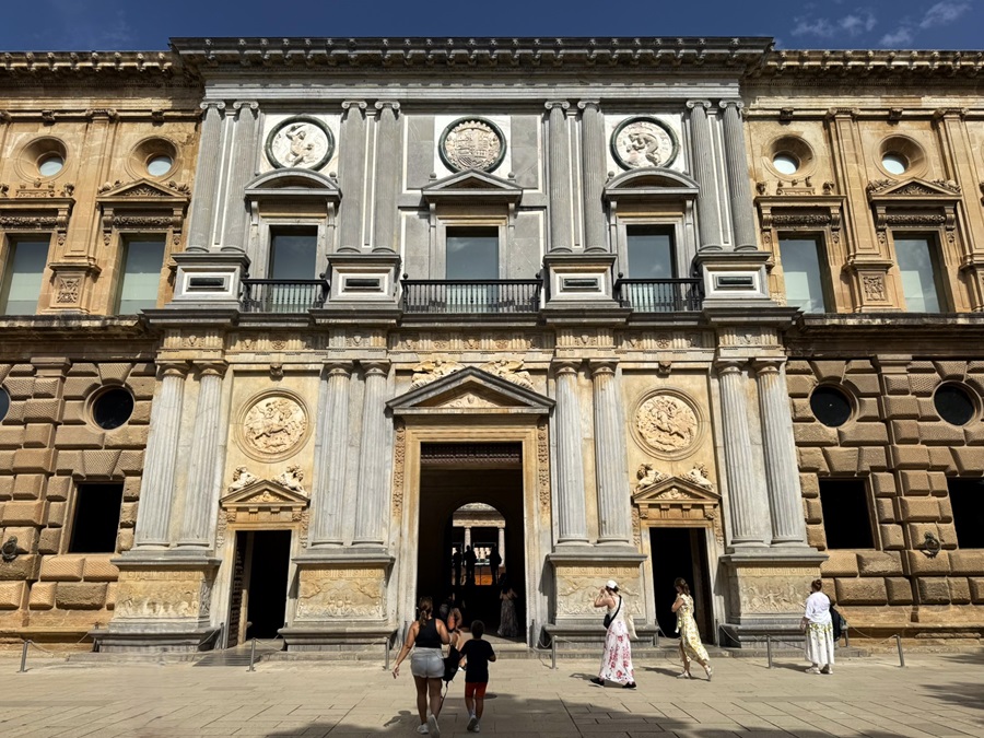 We continued to the Palace of Carlos V, a large square powerful palace. The lower level was bult with these large blocks of stone, reminding me of a palace in Florence. It came as no surprise to learn the architect, Pedro Machuca, studied under Michaelangelo.