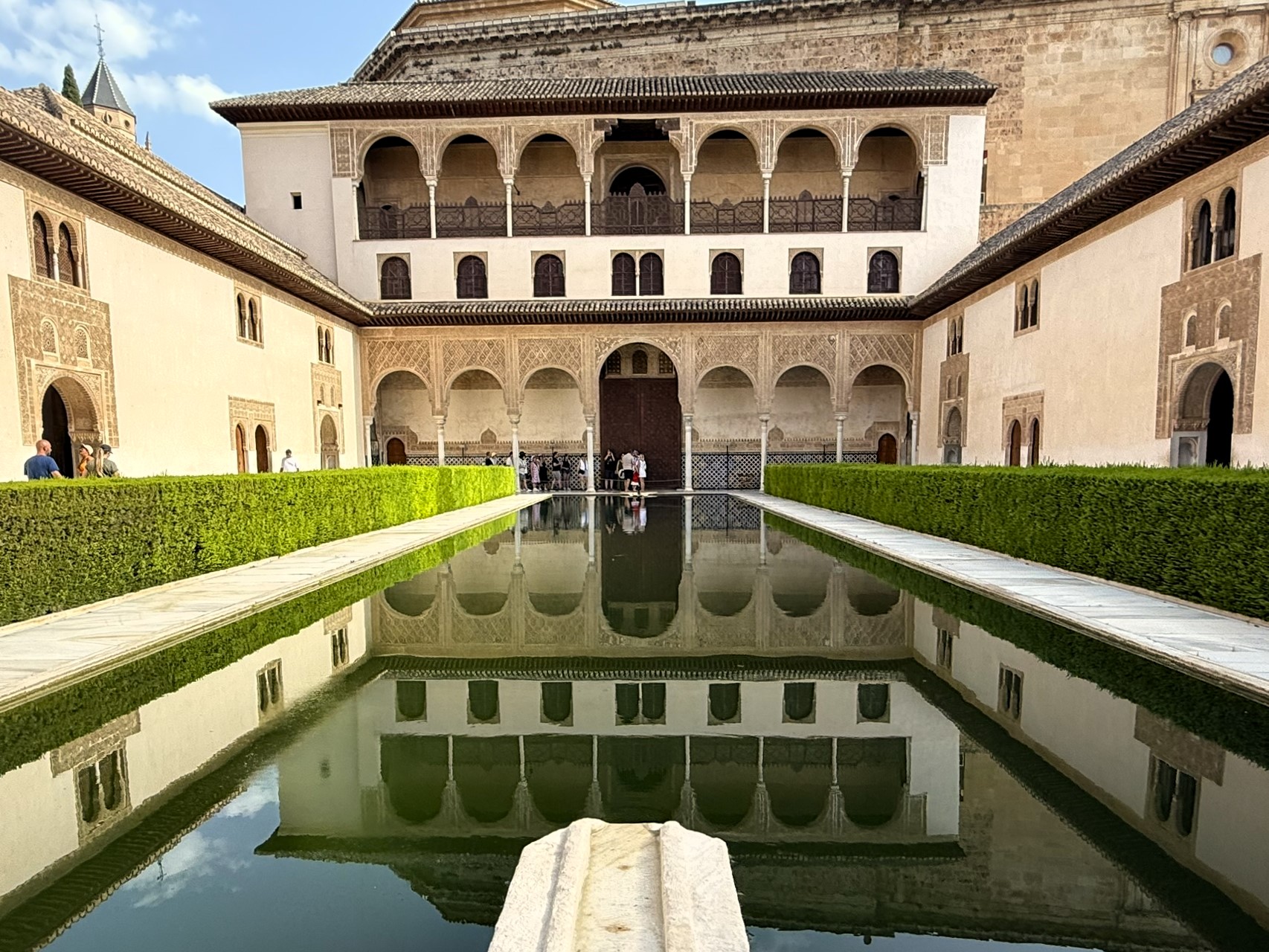 Moving on, we arrived in the beautiful Patio de la Arrayanes, the court of the Myrtles. A pool filled its entire length, surrounded by a precise manicured boxed hedge. A cordon directed us to the left, along the edge of the pool, to the sala de la barca, a beautiful seven arched portico. We looked back along the length of the pool towards a similar structure on the other side.
