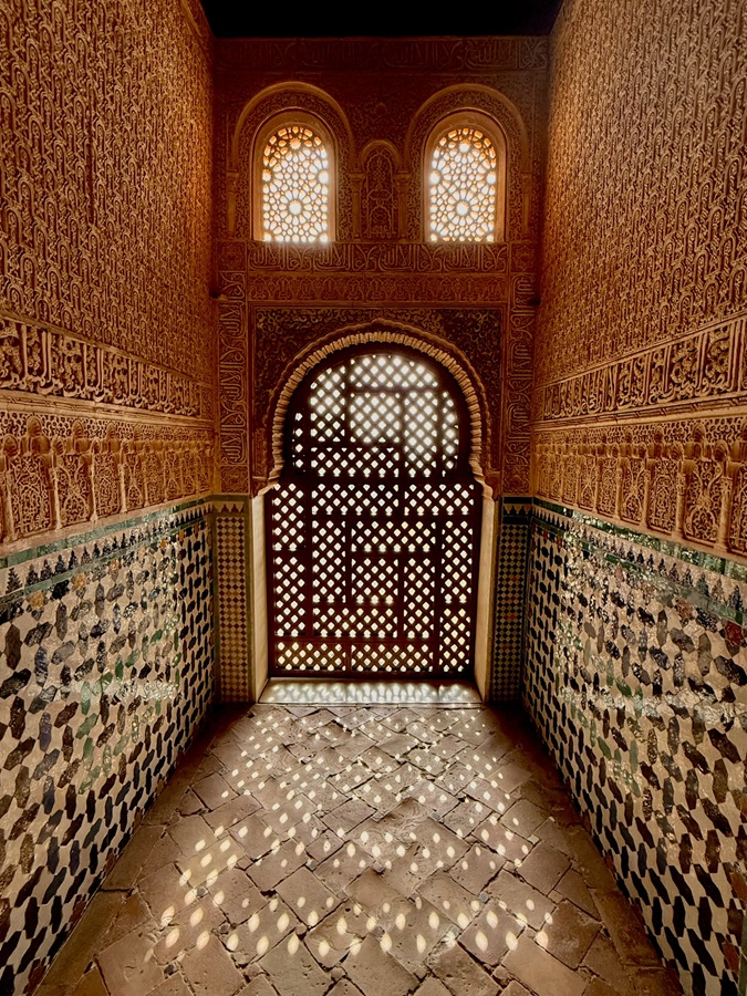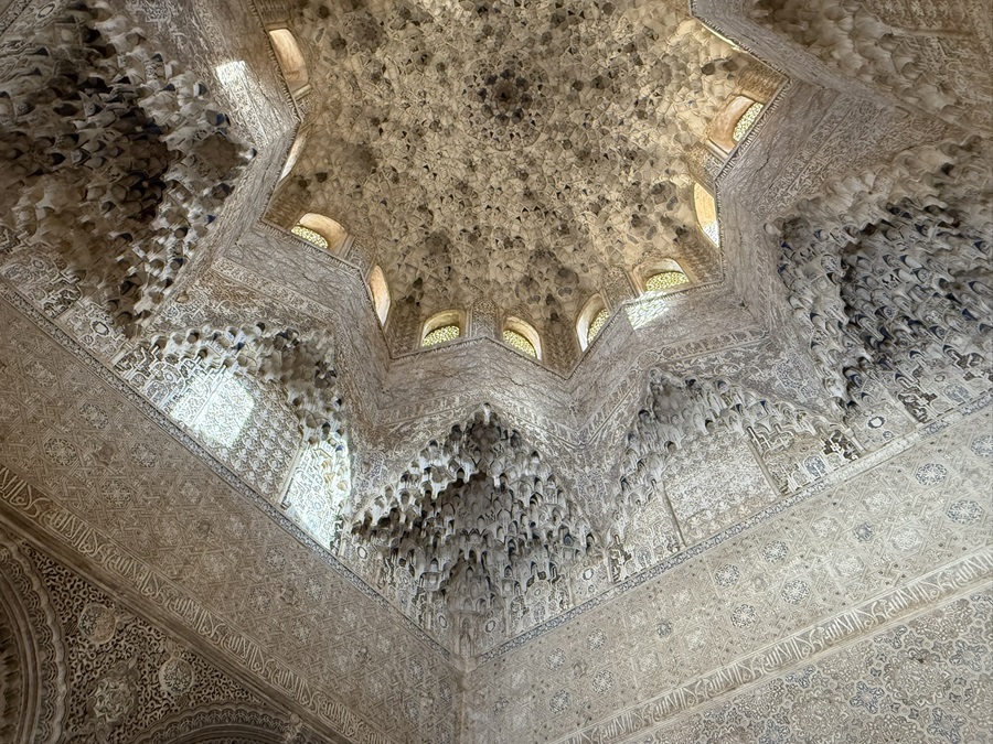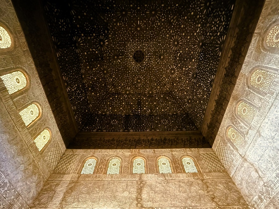 Eventually we stepped away and had a look inside the first hall off the courtyard, Sala de los Abencerrajes. It was jaw-droppingly stunning, an absolute masterpiece. The mocàrabes (aka muqarnas) covering the dome and arches appeared as delicate as lace. There was also something organic about it, as if it were alive or made by a creature. I had never seen anything quite like it, and it really surprised me. It was like the work of a mad genius. The poet Ibn Zamrak described it as the heavens, the sun, the moon, and the stars, which was quite fitting as there was something of the Milky Way about it.