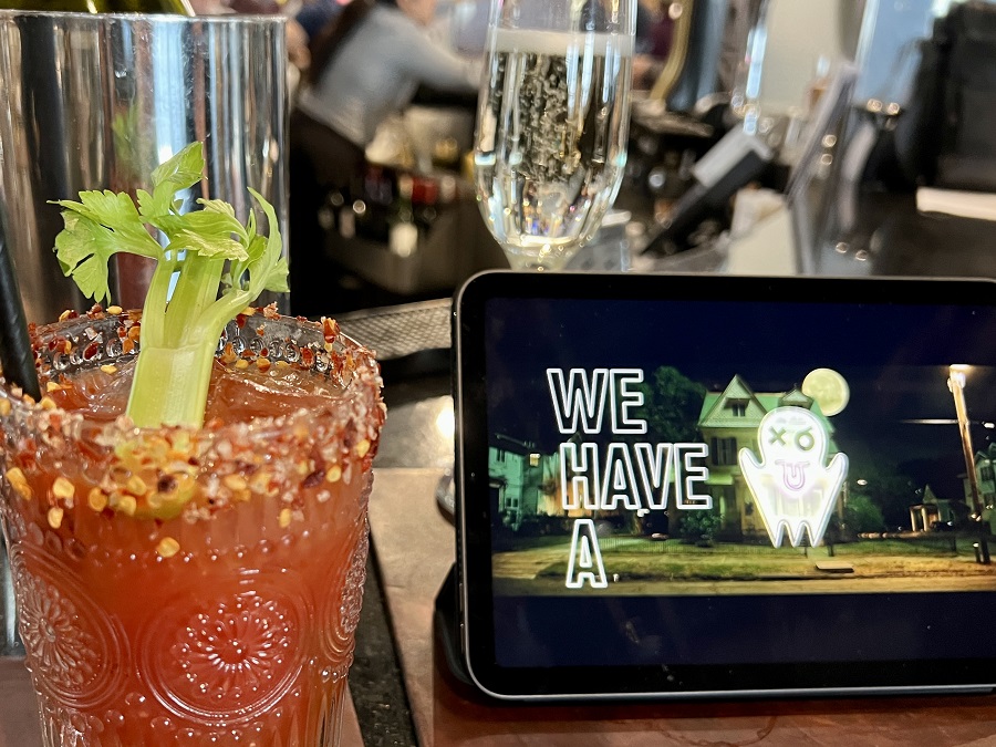 When we arrived at Fortnum & Mason there were no seats available, so we continued to The Pilots Bar, perching ourselves on two bar stools. We ordered only drinks because we were still hoping for lunch at F&M. It was technically still "brunch" so I asked for a Bloody Mary whilst Julie stuck to her airport tipple with a glass of fizz.