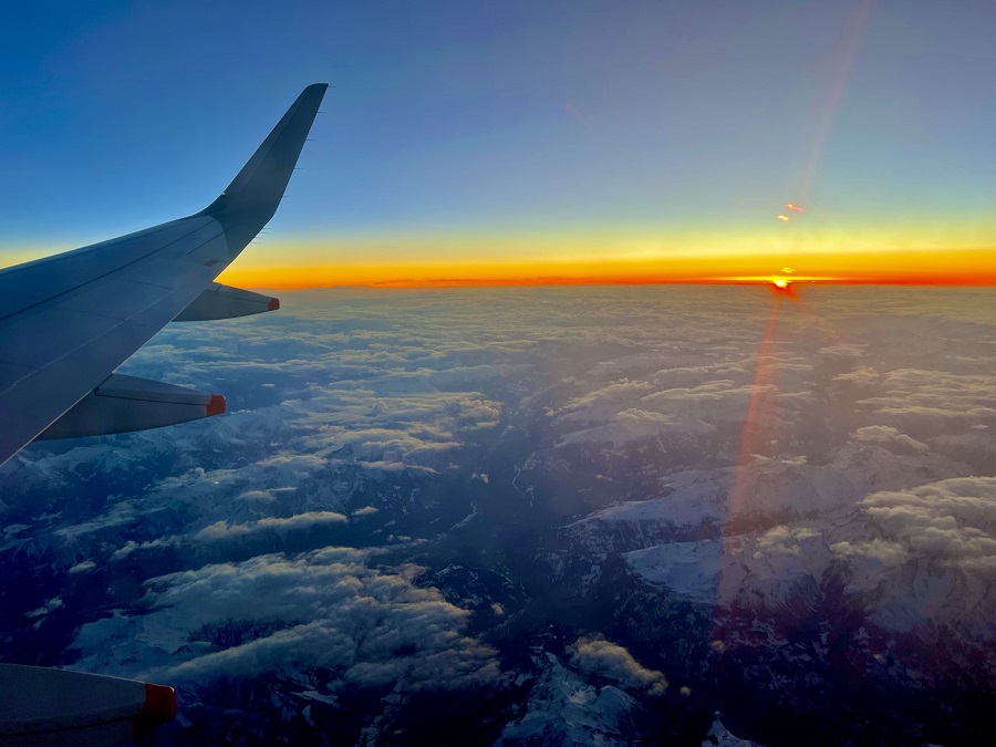 We set off in near perfect weather, a complete contrast to last year's storm Arwen, and our emergency landing back in Heathrow. Feeling more relaxed Julie settled into the flight enough to enjoy the sunset views over the Alps. She continued to top up her courage as we both had a half bottle of Champagne each, paid for by using our Avios points. It was nice to have something for nothing. We tried unsuccessfully to get some sleep, which was probably a good thing. Staying awake until we reached our hotel would benefit us later.