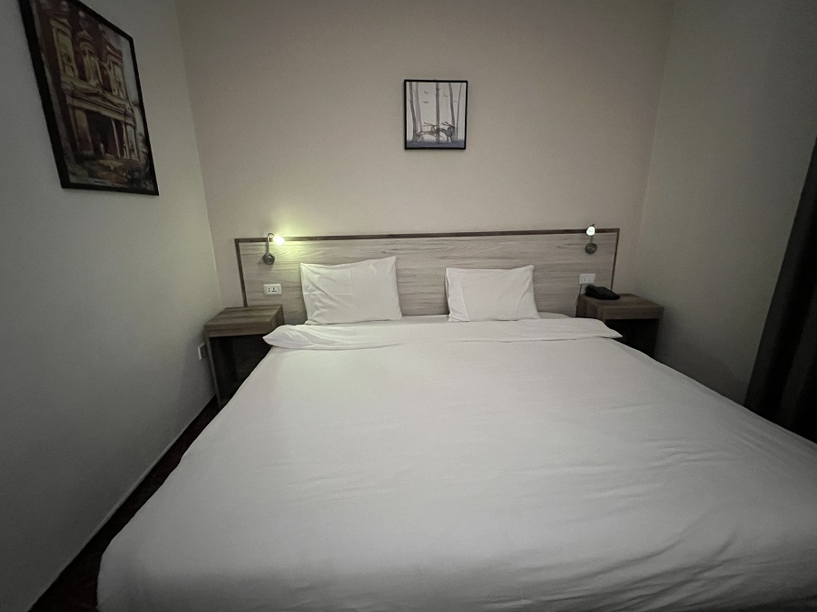 Our first task was to queue and get our entry visa. It cost 40 Jordanian Dinars, (JOD) each which we paid in cash. Whilst in the queue we got chatting to a couple of other couples. One were also on an Intrepid trip, but thankfully not ours, becuase they were very dissmissive of us. I don't think they were in a happy place. Another couple were young and very chatty. He was terribly English and despite her Amerianised accent she was Spanish/German. She had a Palestinian friend who they were visiting in Amman. Moving on to Baggage Reclaim we were relieved to see both our rucksacks rolling out towards us on the conveyor belt. Wth good vibes all round we headed for the exit. Waiting for us was meant to be a transfer to the hotel but we didn't see anyone holding up our names. There was a contingency plan which was to find the transport company's desk. Along the way we bumped into an Intrepid tour rep. They don't usually meet people off the plane but he was here for a cycling tour group. Anyway, he sorted us out and we were united with our taxi driver. It had gone midnight by now but you wouldn't have thought it by the amount of traffic on the road. We even got caught in a bit of conjestion! The journey to our city centre hotel took about 40 minutes.