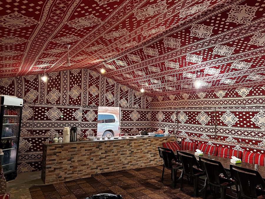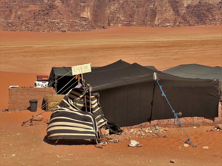 From here we could see a few more camps dotted around the valley, all identical stripey tents, all nestled into the sandstone rock for protection. Our Banouramo Camp was no different placed at the foot of a lump of rock in an area known as Um Sabatah. There seems to be only two types of accomodation in Wadi Rum. The ones like ours the more traditional camel hair tent, dark brown with beige stripes or the futuristic glass domes where life has imitated art because they were inspired by the film The Martian. They looked incredible but out of our budget for this trip.