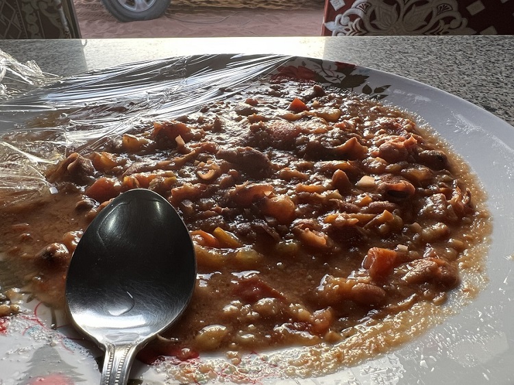 We returned to camp for breakfast in the large tent. The busy pattern on the fabric was even more ridiculous than what we remembered of last night. Already laid out on the breakfast bar were filled bowls and plates covered with cling film. We were the first, so we waited for a while for others to arrive but I couldn't. "That foul's going to get cold" I told myself justifying going in and starting on breakfast.
