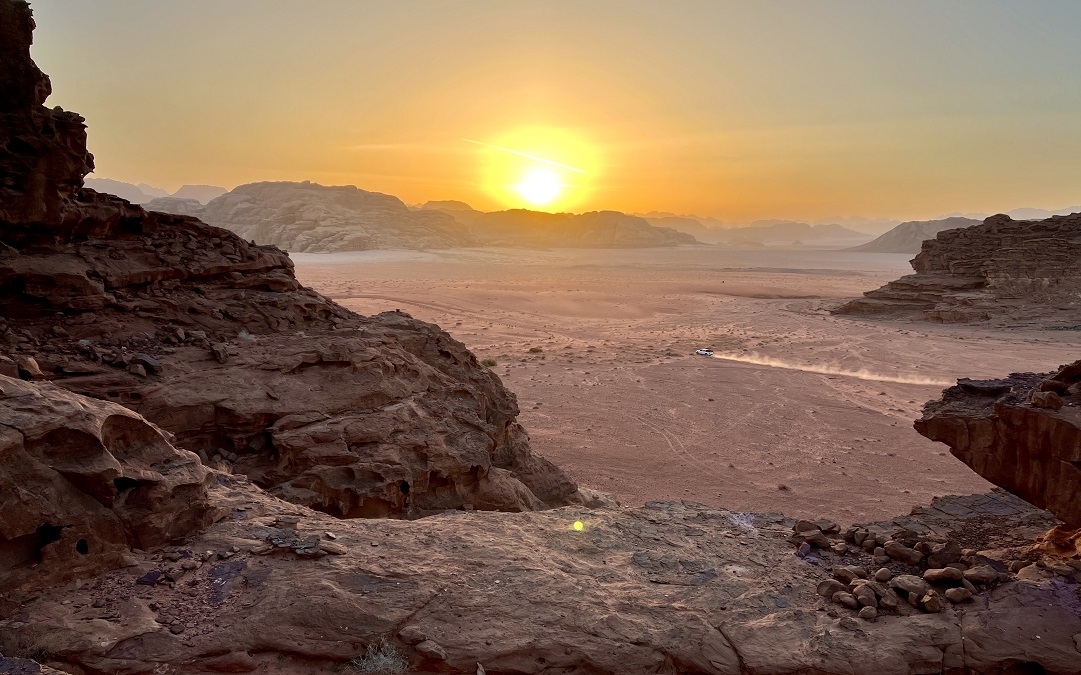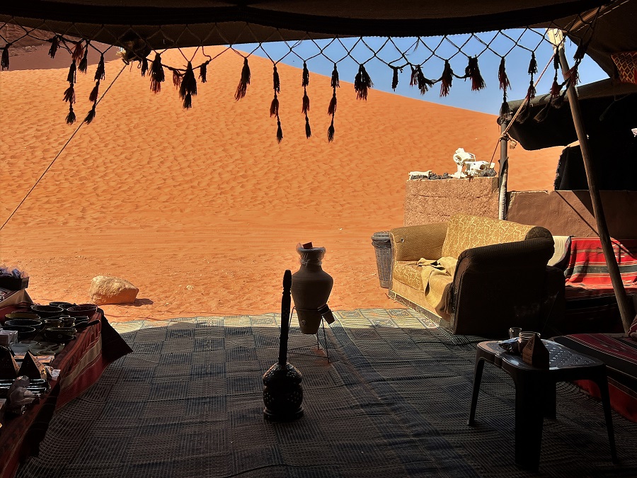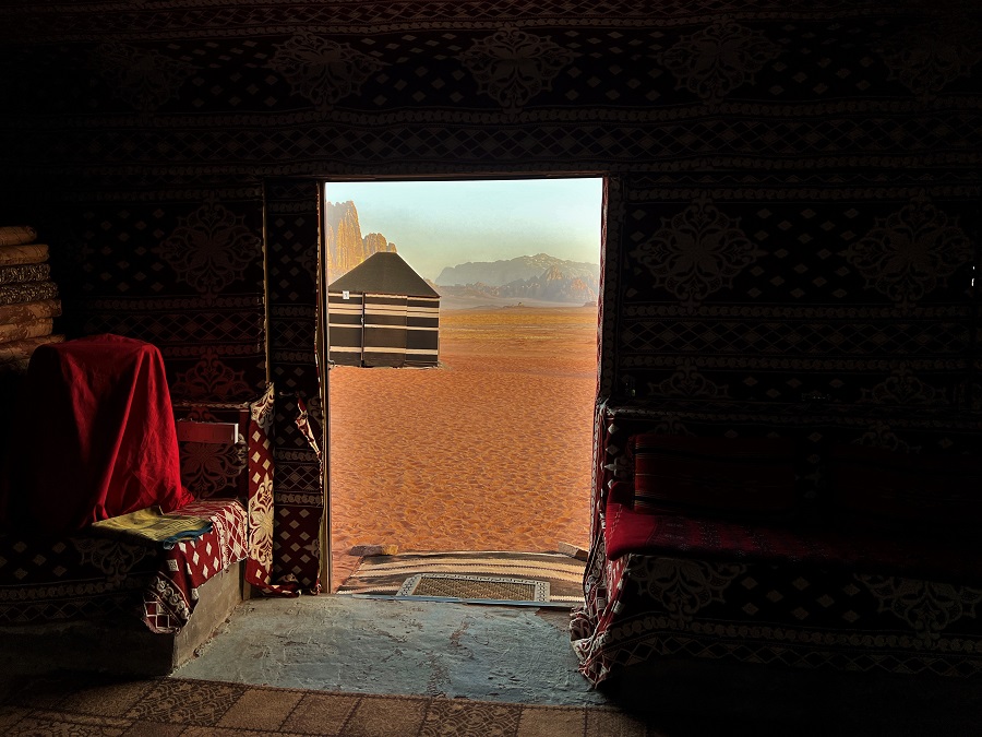 Back in camp we retired to our tent for a siesta. It was stiffling inside so we left our door open. We also (to create a flow of air), opened our window/hatch, which revealed this amazing view of Jebel Rum. This mountain range together with Jebel Umm Ishrin we saw earlier created the Wadi Rum valley. In fact the word wadi is Bedouin for valley, so Wadi Rum literally means the Rum Valley. Gazing out at this incredible landscape we decided this was the perfect momement to celebrate and cracked open the second bottle of Moet & Chandon. It was bad timing really as we only had half an hour before regrouping for a short hike to watch the sunset.