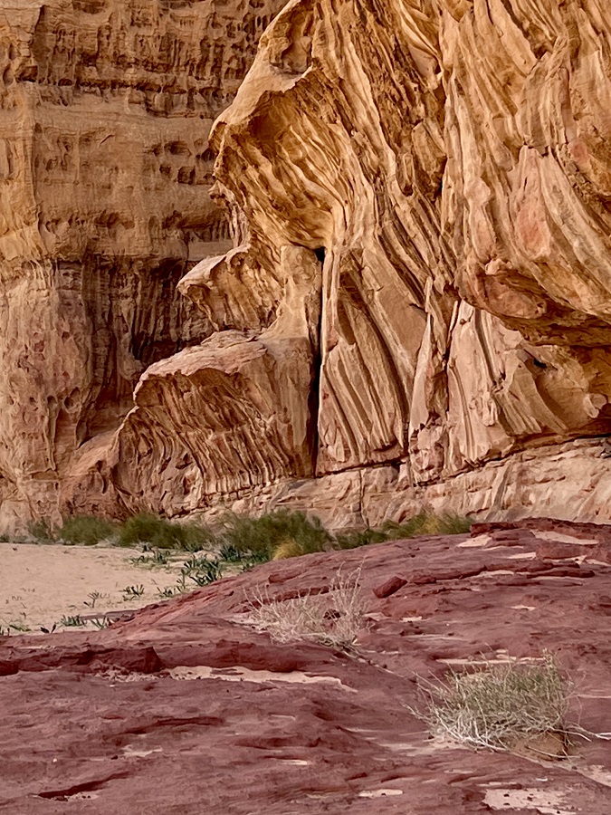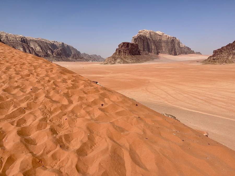 There came a point where the left the red desert and entered the white desert. It wasn't as dramatic as the merging of the water in the Amazon rainforest, but from a distance you could clearly see two distinct coloured sands as we walked across the valley of Wadi Yutum Al-Umran.