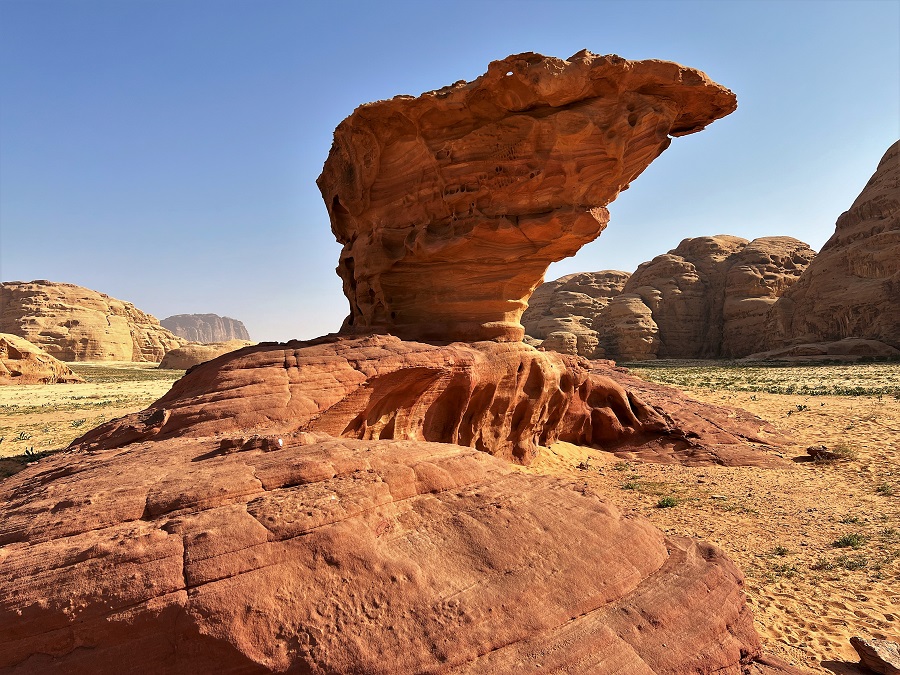 A short walk across an open space and we came to a curious piece of rock, scultpured by the weather, eroded by the sand storms, and leaving something that could loosely be described as a mushroom shape, an Oyster Mushroom perhaps. It was over 5 metres tall. One day it will erode so much it will topple over. As we gathered together at the base for a group photo we hoped that day was not today!