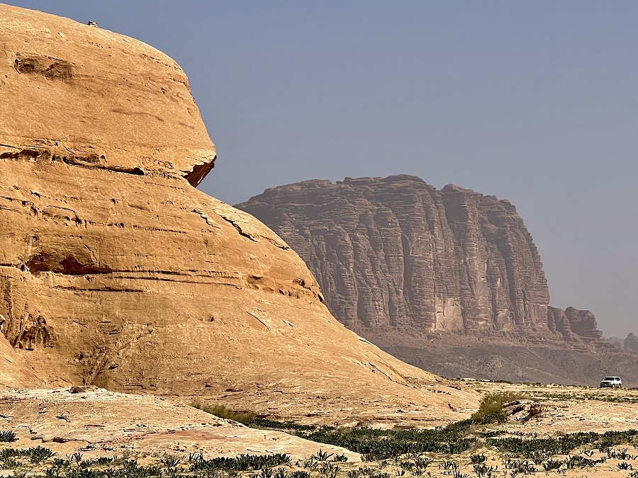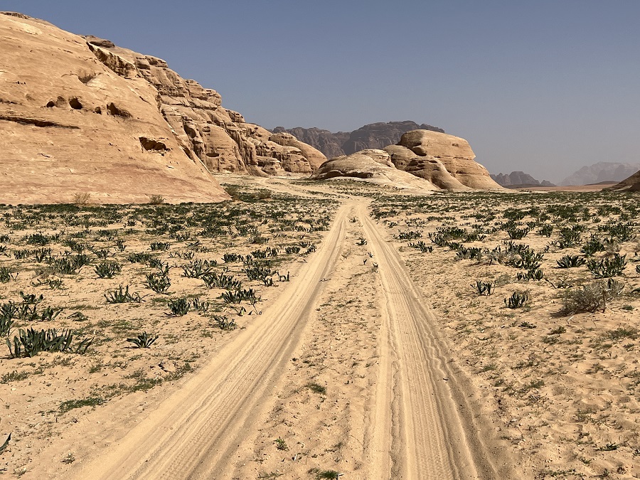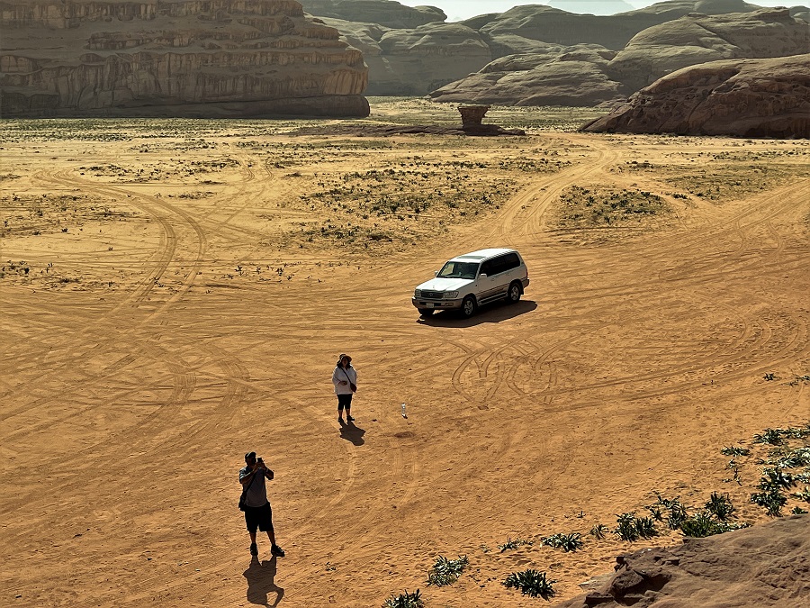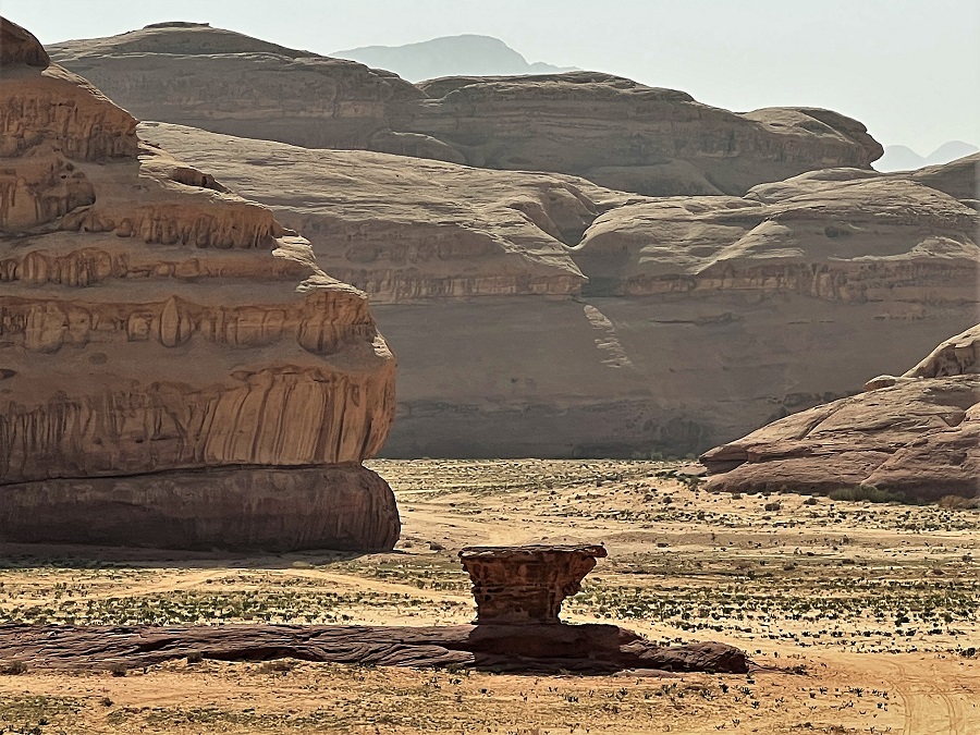 The views were wonderful and well worth the scramble up. To the South East I could see the mushroom-like rock in the distance and the tracks we had followed to reach here. I wondered in the far distance if it may have been Jabal Umm ad Dami, Jordan's highest peak at 1854m or maybe it wasn't.