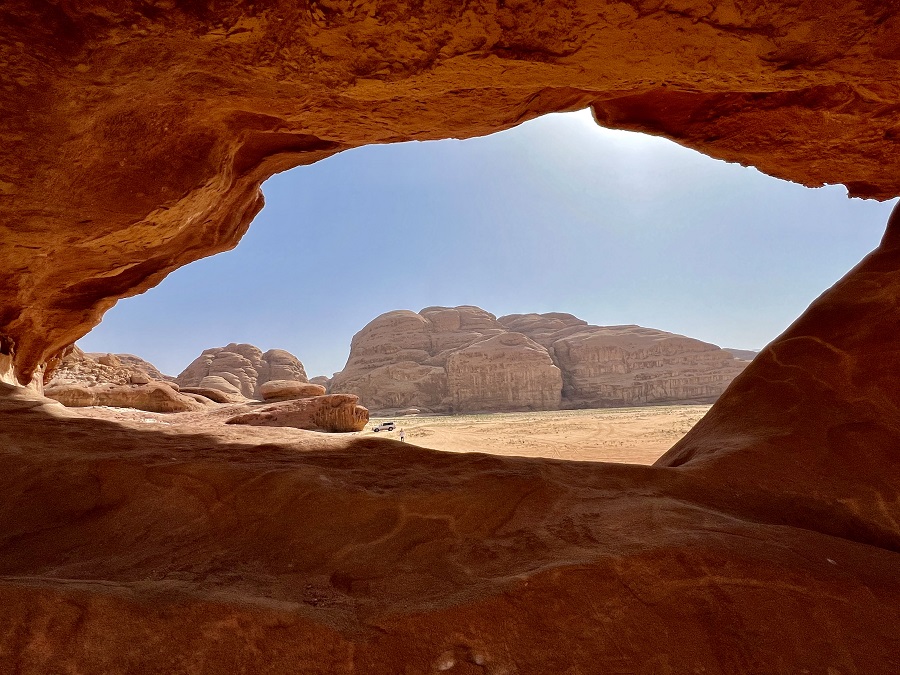 Whilst it was the end of the gorge, if you were agile enough, like a goat, you could have continued your adventure and climbed out of the siq and onto the mountain of Jebel Khazali. I looked up to see it glowing bright above our heads. It was so inviting that it made me wish I was a climber. We returned the way we came, swinging over the deep hole, crossing the puddle over stepping stones and again missing the most significant petroglyphs. Reunited with Julie she told me she had just seen a young girl fall whilst on the ledge. She was being filmed by a friend as she strutted her way across like she was on a catwalk. She then stumbled. Luckily she didn't fall off the ledge but she couldn't bring herself to stand up afterwards and crawled the rest of the way. From Khazali canyon we drove towards the next sight, Um Fruth, one of the most popular rock bridges in area.
