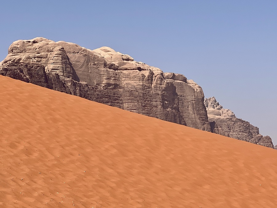 Our first destination this afternoon was the Al Ramal sand dune. There weren't many in Wadi Rum. It's not that kind of desert. We walked towards the sand dune, our jaws dropping as we got nearer. It was a huge drift of red sand blown up against the rock face of Al Ramal. It was busy with people walking up. Everyone was keeping to the left, where the rock was casting a shadow, which was sensible.