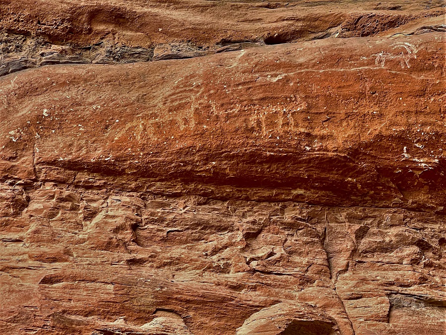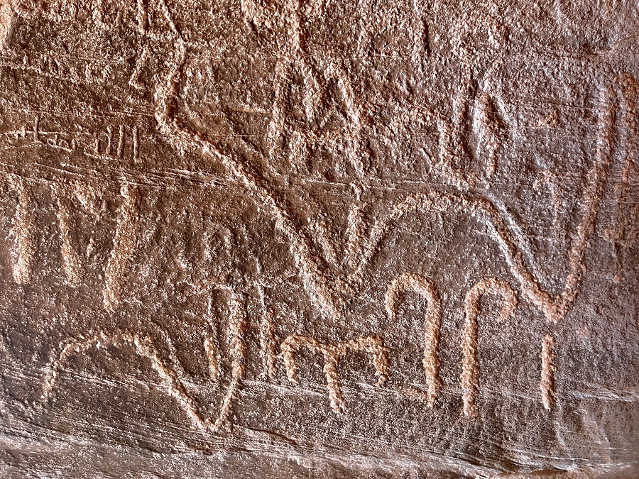 It wasn't long before all the others arrived safely back down from the sand dune and we moved on, driving the short distance to Khazali canyon tosee the Anfashieh inscriptions. I had heard of this place before, a fissure or narrow crack in the rock of Jebel Khazali, where ancient carvings had been found and was excited to see it for myself. Musa retold a tale as old as time, the story of Ali, a petty thief who was chased to the summit of this mountain. With no escape he decided to throw himself off but instead of plumeting to his death he floated down to the ground unharmed. Before I got a chance to quip "what did he steal ... a parachute?" Musa explained that his billowing robes created the resistance and slowed his fall. So the name of the mountain Jebel Khazali is derived from the word khaz, to jump, and the name Ali.