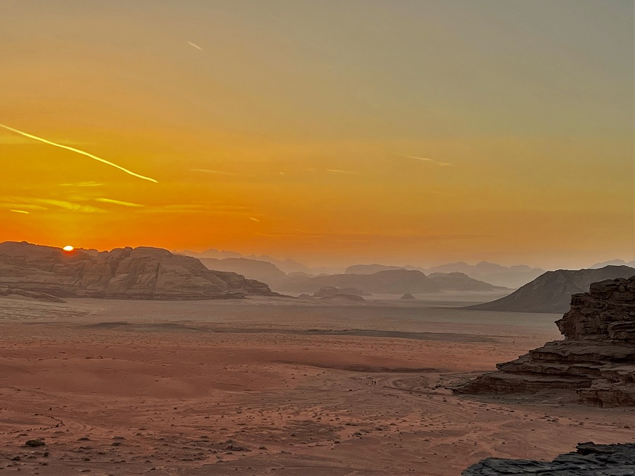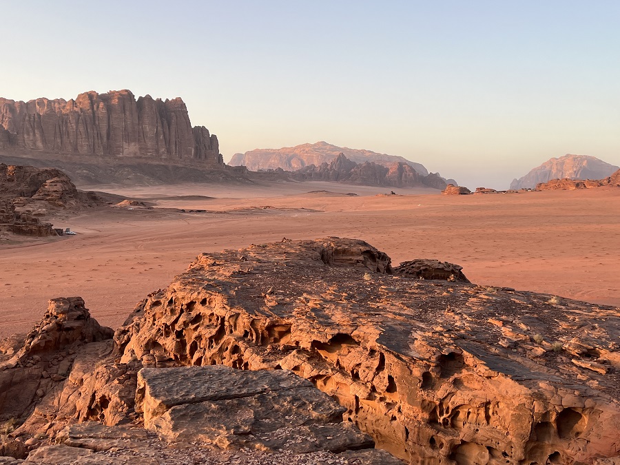 It was quite blustery up here and the temperature was dropping so we walked around the ledge looking for some shelter from the wind. Facing North, away from the sun, we saw the three mountains of Jebel Qattar, Jebel Rum and Jebel Um Ishrin. It was a beautiful sight.
