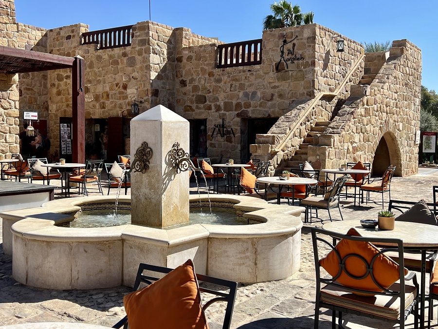 We could also see the St. Garabed Armenian Apolistic Church with its crenalated roof. Twenty minutes later we were still waiting for our bus to take us back up to the Visitor's Centre. Eventually the bus arrived and we were back where we began almost two hours after the taxi driver dropped us off. We apologised profusely to Inad for the delay. We told him we'd only be an hour. He was gracious not to be annoyed with us. I'm sure we're not the first he's taken to the baptism site. Thankfully, our onward journey to the Movenpick Dead Sea Resort took less than twenty minutes. We paid Inad the 40 dinars as agreed but also slipped him an extra 10 dinars for having to wait so long for us. We checked-in at reception, which took a while. There only seemed to be one person behind the desk and she was dealing with an awkward customer. After we got the formalities over and done they offered a ride down in a golf buggy. I almost delclined but I was glad I didn't. It was quite some distance away. It took us several minutes to drive there.