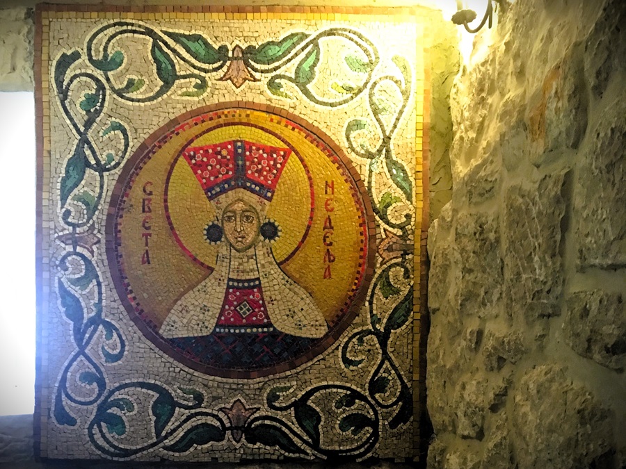 Eventually, after an hour of queuing, we reached the Church of Presentation. The entrance was hardly 4 feet in height. Even Julie had to duck to get inside! It was dark at first as we walked through the first room, with walls covered in vivid orthodox iconographic frescoes. Above the next door there was an area that hadn't been restored. It was faded and difficult to make out but it appeared original and centuries old. That small piece was more special than the rest of the room. We waited to be allowed into the next room. It was a one in one out and they had someone controlling the flow of people. When we entered, we did so together, stepping into a small room, with only enough for five or six people. Sat in the corner a priest was deep in prayer, dispensing blessings. Then, displayed in front of us in a reliquary, a glass coffin, were the remains of St. Basil of Ostrog. It was only in that moment we realised we had come to the holiest pilgrimage site in the entire country. St. Basil, born Vasilije Jovanović, dedicated his life to Christianity, becoming the Bishop of Zahumlje and Herzegovina. He oversaw the founding of the church here. After his death in 1671 his body was buried at Ostrog. He arguably did nothing miraculous, or worthy of sainthood in his lifetime. However in death he became known for his apparitions, appearing in peoples dreams to guide them. The first one noted happened seven years after his death when he appeared to Abbot Kasjerac. The abbot then convinced the church to exhume the remains of St. Basil to find a perfectly preserved body and the smell of basil incence. Since then people have testified of miraculous healings and recoveries after receiving a blessing in the presence of his relics. All of this took us by surprise. We didn't know how to react. Those of us in the room waited our turn to pay our respects. "Just follow what they do" went through my mind, but the lady in front of us lunged forward, virtually kissing the feet of the saint. If only she could. She seemed desperate for a miracle. Then it was our turn. We respectfully bowed our heads, looked solemn and moved on, slightly embarrassed. I dropped a few coins into the collection box and we left the church the way we came in. It had to be one of the strangest experiences we have shared.