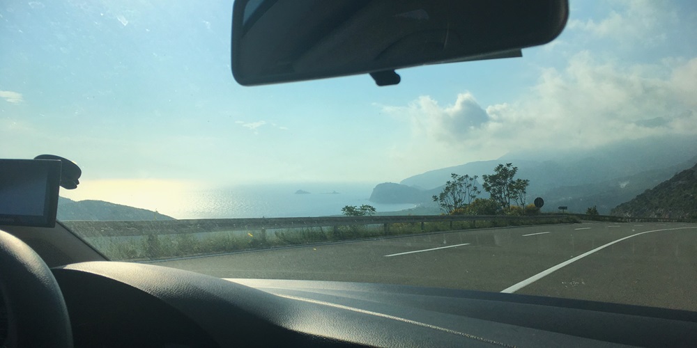 When they arrived we laughed out loud. Not only because they were extremely rustic, nothing more than literally a piece of torn baguette, and a slab of cheese. But also they weren't the lighter choice we were expecting, the bread was the size of a small loaf! At least the homemade cheese was tasty and the bread was softer than it looked. Back on the road we soon came to a toll where we paid €2.50 to use the Sozina tunnel. At over 4km, it was the longest road tunnel in Montenegro. It felt strangely hypnotic driving through this repetitive view, with only the lights giving us a sense of movement. This shortcut through Paštrovska Gora mountain saved us 25km. When we finally emerged the other side we were almost at the Adriatic coast. Moments later we could see the sea for the first time. We began to get a little excitable.