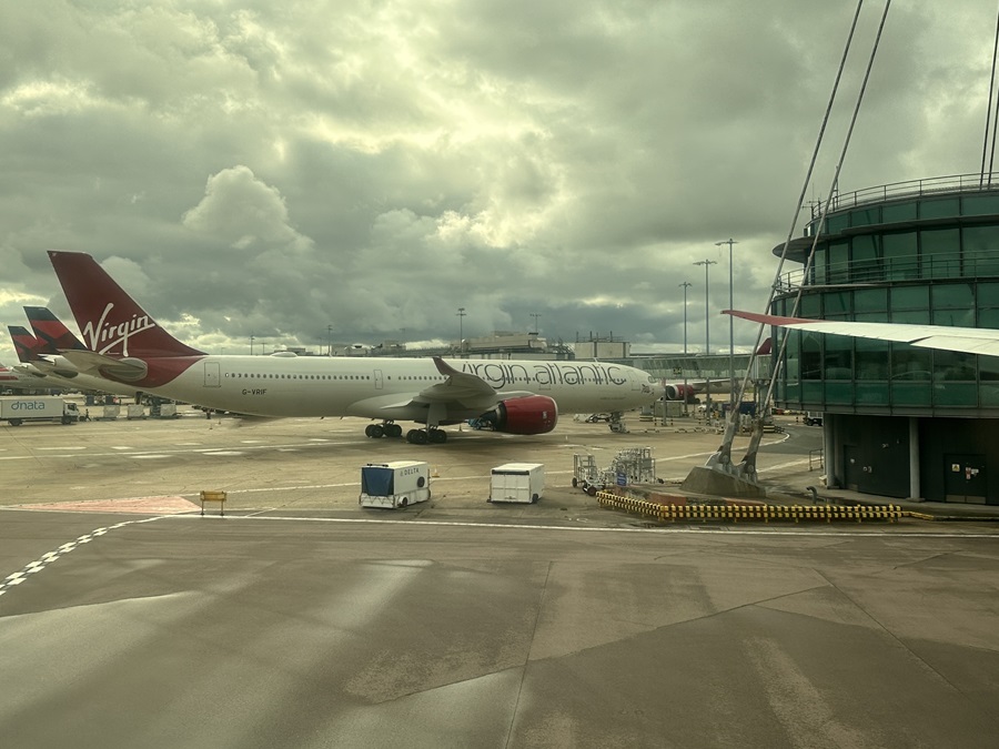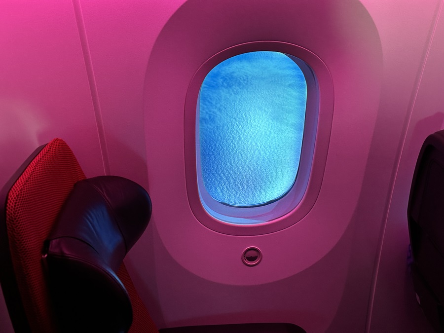 An hour later our gate number came up. "Well, they haven't cancelled the flight yet" I said, finally admitting to Julie there was a risk. Julie grabbed a sandwich and two small bottles of Dutch courage from Pret-a-Manger before making our way to gate 26. Boarding went smoothly and we sat in the back row of the Boeing 787. We had purposely paid to sit here because on the seat map the tail narrowed and they were suppose to be just two seats together. The type of plane must have changed and we were sat in a regular row of three sheets. Fortunately no one else turned up, so we still had the row to ourselves. Sonya and Garry had also paid for seats to be sat a row in front of us. We took off more or less on time, 11:30am.