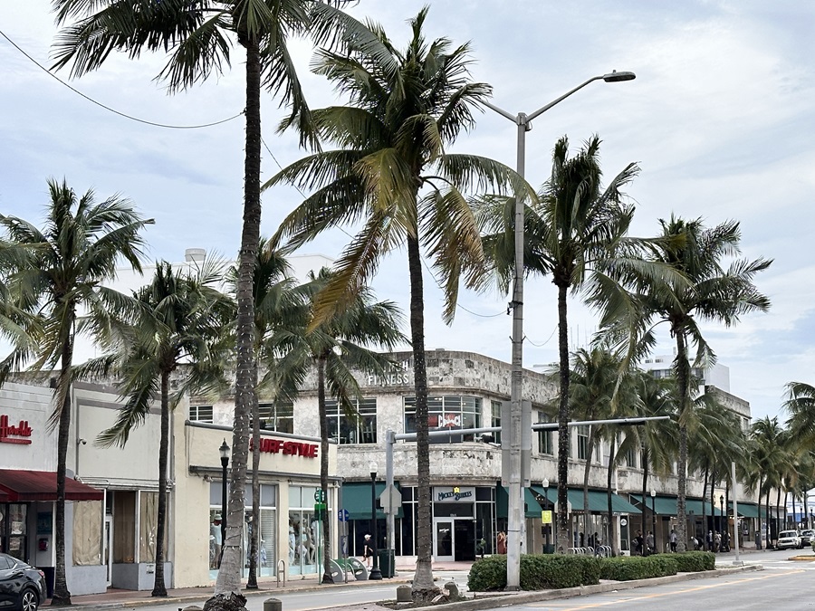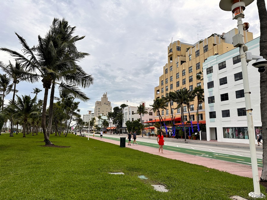 I wanted to take a photograph of the famous quirky lifeguard huts. They were dotted every couple of hundred metres. There were now about 38 of them, in several different designs and the whole spectrum of bright colours. Apparently the trend to instal these art deco inspired huts began in 1992 after the last severe hurricane to hit Miami destroyed all the previous towers. Obviously we had the beach to ourselves. No one else were mad enough! It was soon time for us to leave. So we picked up our luggage, put our head down, and pushed our way against the wind, back towards the shelter of 14th Street.