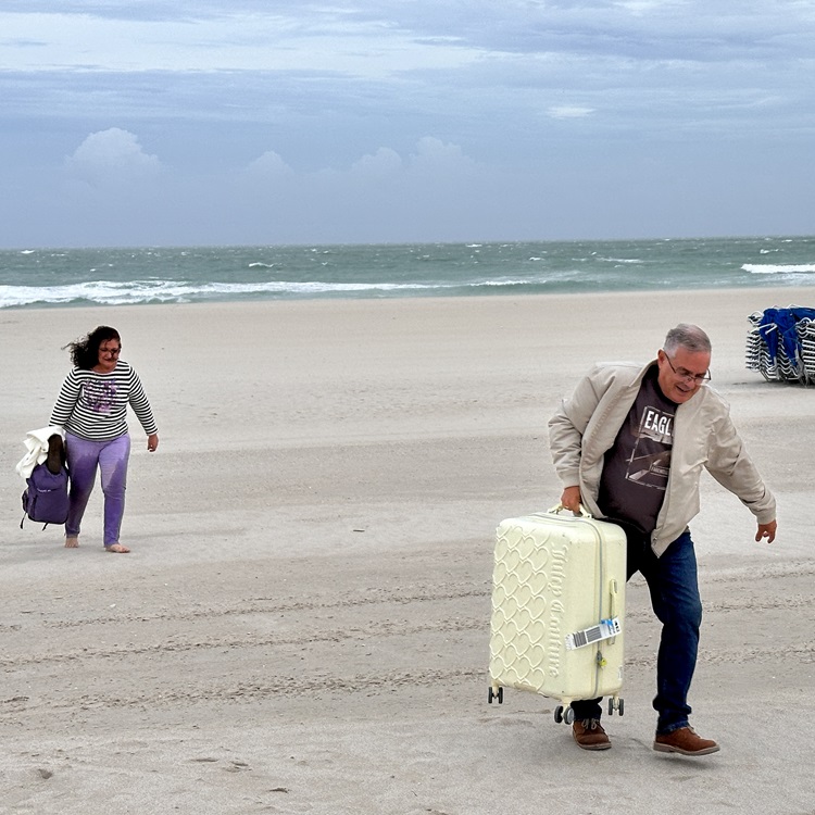 So we had no choice but to carry our bags the short distance down 14th Street, crossing Collins Avenue to reach Ocean Drive and access to the beach. The wind didn't seem too bad walking along the streets. We seemed to be sheltered from the worst of it. But when we stepped out onto the exposed beach we really caught the full force of its power. Every now and then even stronger gusts would try and blow us over. All the while the sand was whipped up, blasting in our faces, giving us one hell of an exfoliation.