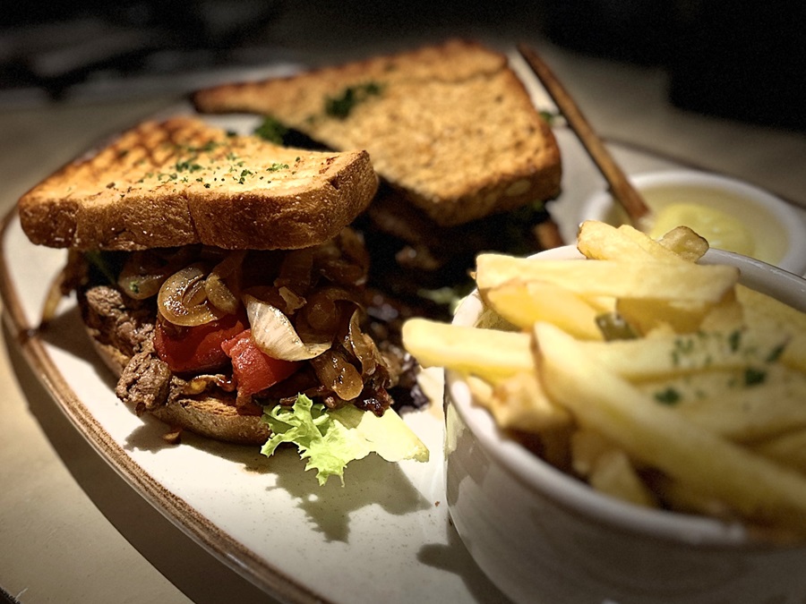 He failed to notice that it came under the heading of "Big Toasted Sandwiches" and when they described it as a sandwich and a half, they literally meant it. "I don't know whether to eat it or climb it?" said Garry. He ate it all but left the crusts.