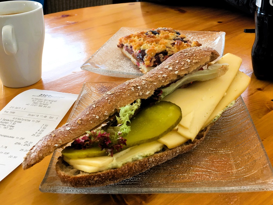 We decided to share a great looking cheese baguette and a cherry crumble cake. The bill came to over 25 swiss francs which was expensive. What shocked us the most was 6 swiss francs for a diet coke! I mean, there was no effort for them to produce it, just open the crate and put it in the fridge. The baguette, the cake, even the coffee I could understand the inflated prices but a regular bottle of diet coke costing £4.50 !?!?!? Day light robbery! We didn't spend long inside. I was wearing my thermals and begining to get a bit warm and sweaty.