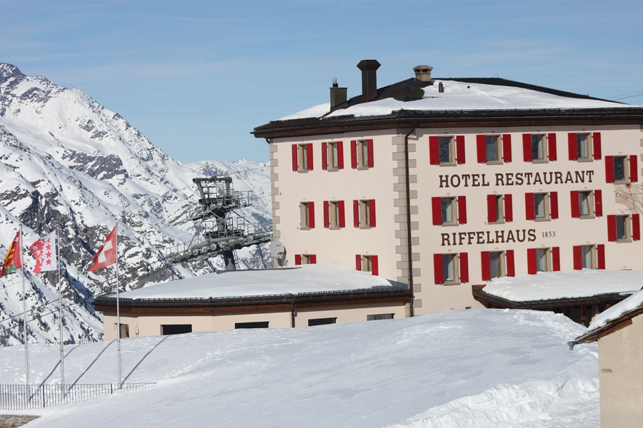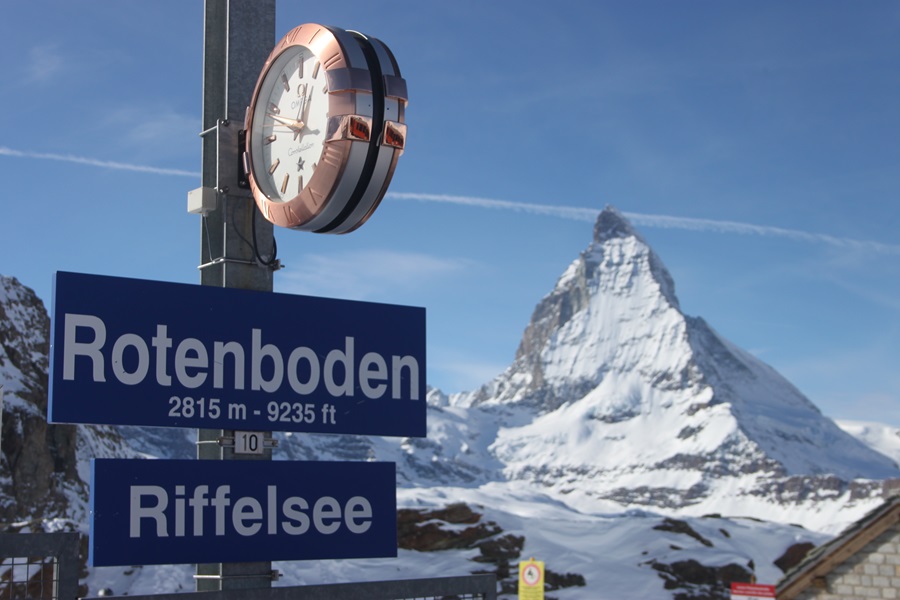 We set off on our journey, stopping once again in Zermatt at a smaller station, before rising, slowly at first, above the rooftops, crossing the Findelbach river. All the while we could see the Matterhorn. From there the gradient increased dramatically as we climbed up the side of the mountain towards the Riffelhorn, a peak along the Gorner ridge. The train stopped at Findelbach, Riffelalp and Riffelberg and then Rotenboden before our final stop.