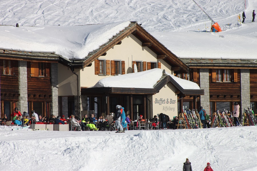 The largest building by far in Riffelberg was the Buffet & Bar. It looked a very popular après-ski spot. Reaching it however was possibly the greatest challenge of our hike! We navigatged a steep slope. "Trust your yaktrax" I told Julie as the ice-grips were doing their job. We shuffled down sideways, as if we were wearing skiis, holding hands, supporting each other. Then, taking little baby steps, we walked past children having lessons on the nursery slope. We felt ridiculous! Relieved, we arrived at the Riffelberg Buffet and Bar. It provided exactly what is said on the tin, a buffet and a bar.