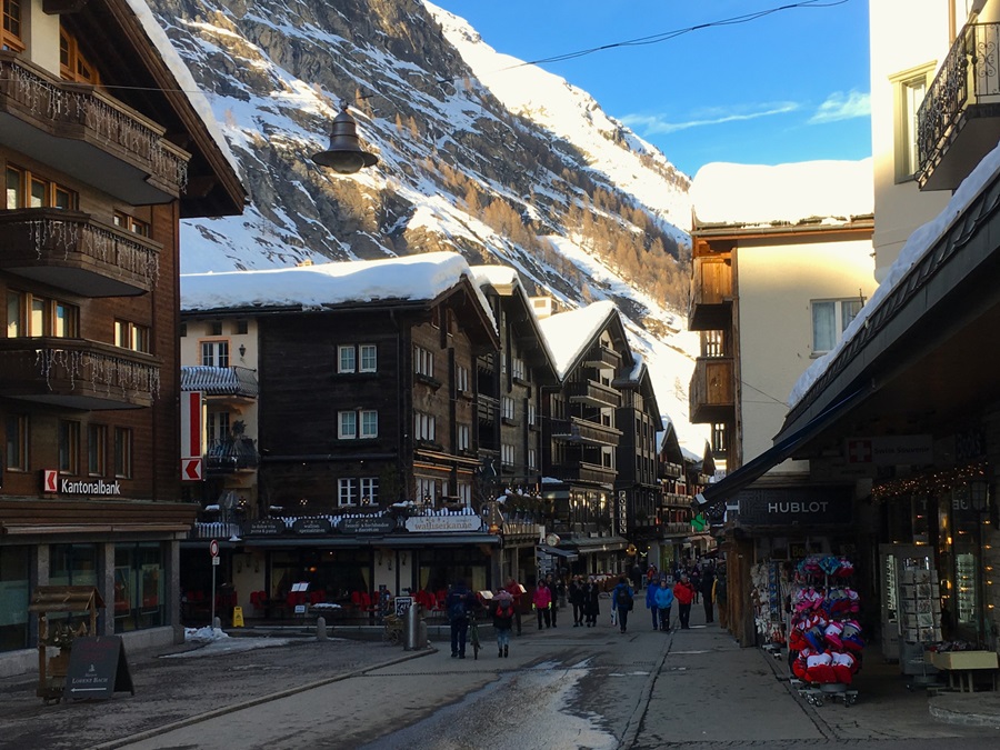 We rolled into Gornergratbahnhoff (train station) It was only four hours ago we left which surprised us. It felt like a jolly big adventure and a long day. Having not explored Zermatt yet, we decided to stroll through the town before it got dark. The main street was Bahnhoffstrasse, filled with cafes, bars, ski wear stores and souvenir shops.