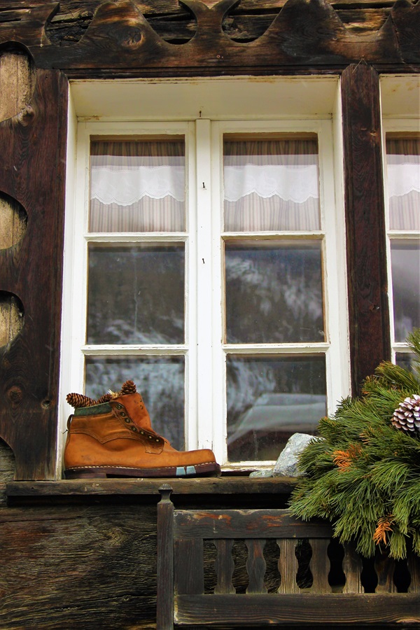 We walked down the main street stopping for a moment to take a photo of this random shoe left on a windowsill. I thought it was a shoe someone had found and placed there but I realised it was intentionally ornamental, painted in a brighter colour and artistically filled with fir cones.