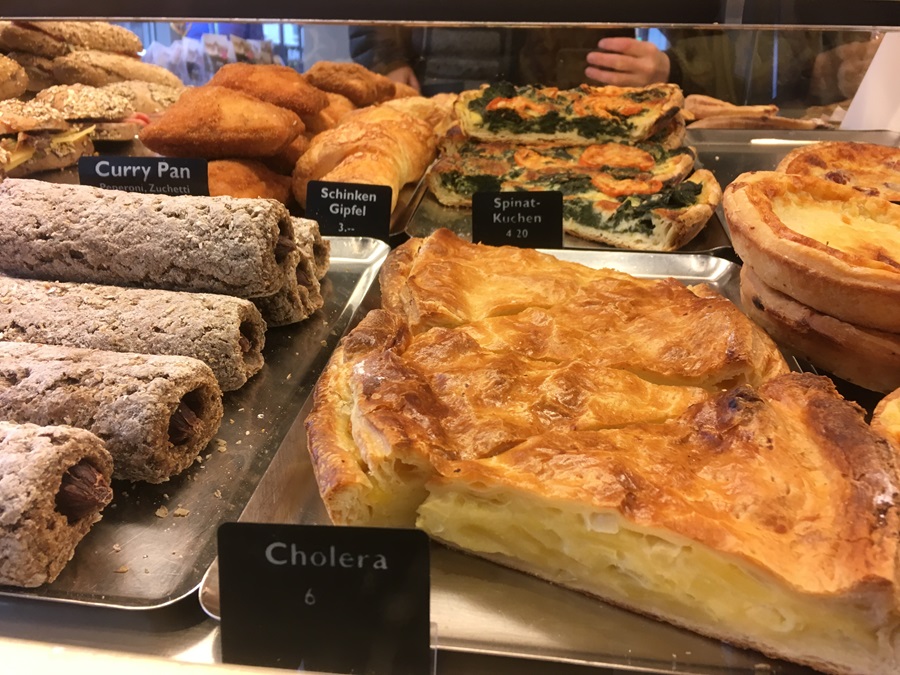 Back on our balcony I wolfed down the quiche first. It tasted incredible. I then had a closer look at the slice of Cholera. I was checking for flecks of wafer thin ham or something but after searching the internet I learned Cholera was a traditional pie of the Valais region, a pastry filled with thin layers of potatoes, leeks, cheese and either apple or pear. It was a thing of beauty. The ultimate comfort food. Some believe it was a pie borne out of neccessity during a cholera epidemic in 1836 where food was scarce and they had to rely on local produce alone.