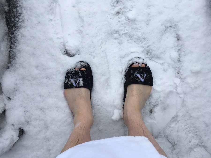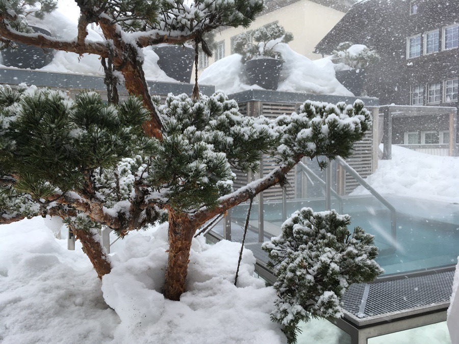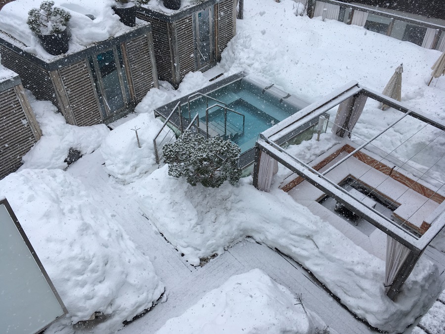 Post-lunch it began to snow, thick feathery flakes of snow. We looked out, from our balcony and noticed the hot tub was free. Minutes later we were in our robes and swimming costumes heading down in the elevator.