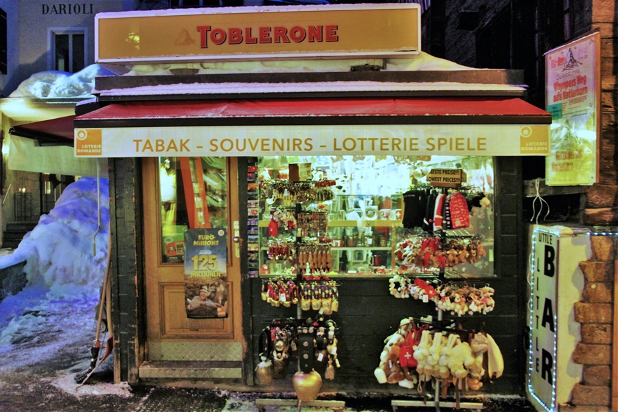 We continued down the main street, coming cross the first reference to Toblerone we had seen in the actual shadow of the Matterhorn, when we saw a small kiosk selling souvenirs, lottery tickets, tobacco and, I assume, the triangular chocolate.