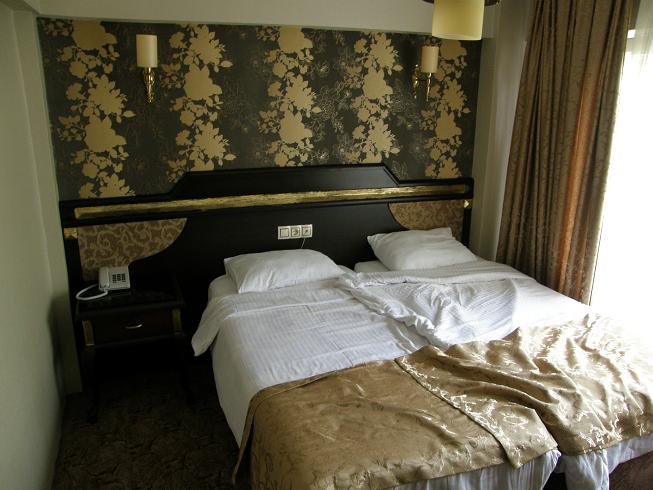 At the end of Klodfarer we finally reached Sultanahmet Park Hotel. The red carpet was out for our arrival. We stepped up to the reception desk and handed over our booking confirmation. He looked at us confused, then worried and then relieved when he realised we had walked into the wrong hotel. We should have been next door! Somehow we had walked straight past the main entrance. We eventually stepped inside our hotel where we were met by a very chilled out man in a grey polyester suit. After confirming our details and taking our passports he handed over the key to room 302. "It's on the third floor" he said as he lead us towards the elevator. "We'll bring the luggage up" he added. When the door opened to the elevator Julie refused to step inside it. It was very compact. We decided to walk up the staircase much to the manager's amusement. By the time we reached our room it was the chambermaid who was coming out of the lift struggling with our two suitcases. We opened the door and our heart sank. We had paid extra on bookings.com to reserve a room described as "Double with Sea View". It failed on both accounts. It was a twin bed room and the view was of the fire escape and the tree tops. "No, we booked a room with a large bed" we tried to explain to the chambermaid. "OK" she said then began re-arranging the furniture. She was struggling a bit but we had no inclination to help. We just stood and watched as she huffed and puffed. Before we could ask " ... and the sea view?" she left. It would have been interesting to see what she would have done then? Chop the bloody trees down? Before unpacking we took our complaint down to the manager who was spectacularly unsympathetic. "No, you paid for a standard room" he said pointing at the €122 rate ignoring the rate for tonight quoted at €142 and that the booking confirmation had "Double Room with Sea View" clearly printed in bold san serif font. We asked if he had a double room available but the hotel was full but for another twin room on the 4th floor on the front. There wasn't anything we could about it so we gave up in the end. At the back of the hotel there was supposed to be a walled garden area and we thought perhaps we could just sit outside and relax for a bit before we head back out into the busy streets. As we walked out the manager said "Uh, it is closed". He wasn't kidding. Tables and chairs and rolled up carpet were stacked up like it was a storeroom. Another disappointment. He kindly offered us a complementary welcome drink bur we refused his hospitality, we weren't in a good mood. We returned to our room closing the curtains on our tree tops view and began to unpack. It didn't take us long to find more faults.