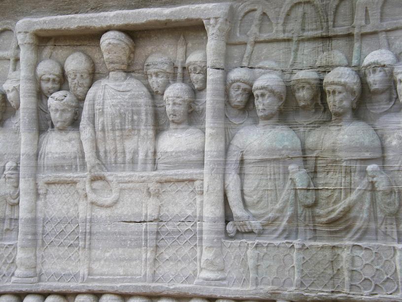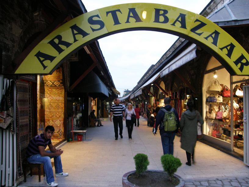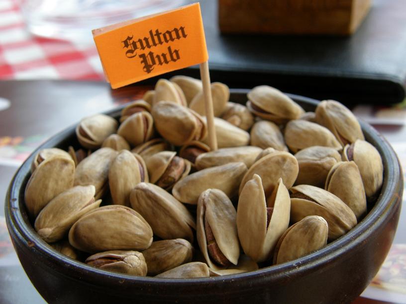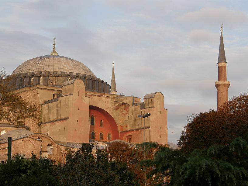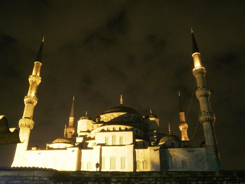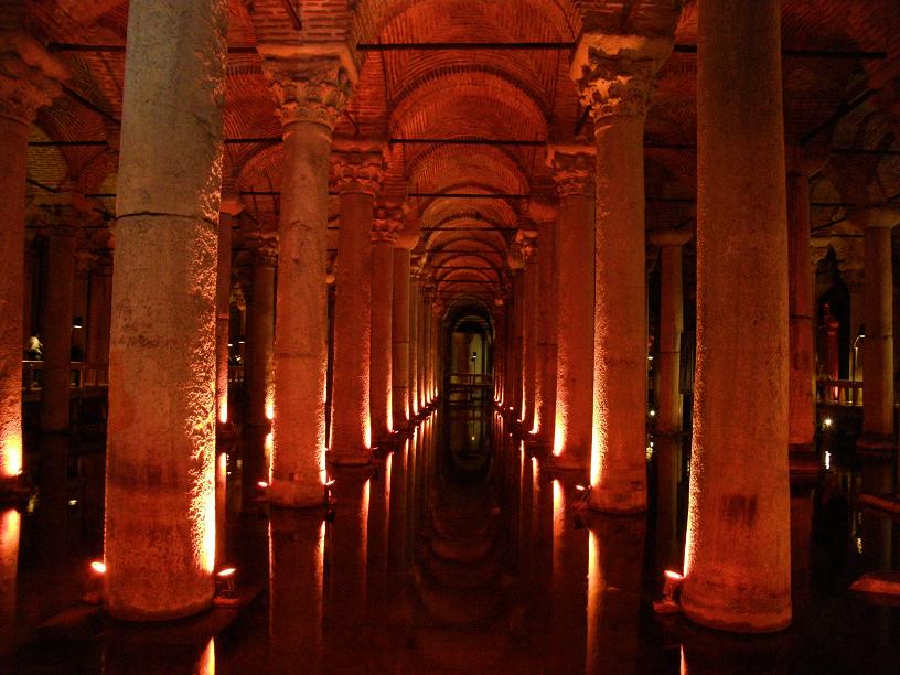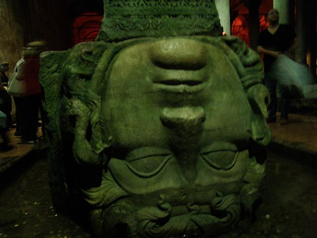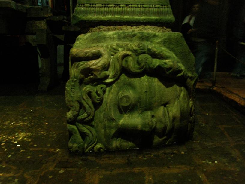 The most striking of the columns in line was the Egyptian Obelisk. Emperor Constantine brought it here from Luxor as part of a huge building project to turn this city into the new capital of the Roman Empire. He named it rather immodestly after himself, Constantinople. The perfect obelisk stood on a granite plinth with a carved bas relief of Emperor Theodosius I standing in the Royal Box or kathisma holding a wreath ready to crown the champion. It was amazing to look at this snap shot of what used to take place here 1500 years ago. Flavius Theodosius was the last ruler of the great Roman Empire. Following his death it was divided into a Western and Eastern Roman Empire. Within a century the decline and fall of the Western empire was swift whilst the Eastern empire flourished. It became known as the Byzantine Empire and survived a further thousand years until the 15th century when the Ottoman Turks invaded. Next to the obelisk was a street vendor selling roasted chestnuts and chargrilled sweetcorn. We weren't hungry but bought a corn on the cob to share just for the experience. We walked around the hippodrome nibbling our corn like two little squirrels. Apparently one of the columns here was missing, stolen during the sacking of the city by the Christian Crusaders when they attacked their fellow Christian Byzatine rulers. It was the 4th crusade and as always the sequels are never as good as the original. The column was topped by four bronze horses which can now be found decorating St.Mark's Basilica in Venice. Alongside the Hippodrome stood the Sultan Ahmed Mosque also known as the Blue Mosque; quite possibly the most famous mosque in the world. We didn't have a clear view from here. A short distance away was another monumental buidling the Haigha Sophia. It was getting late in the afternoon and with scheduled closing times fast approaching we agreed that it would be better to postpone visiting these incredible sights until tomorrow when we could spend more time on them. One attaction that wasn't going to take us too long to walk around was the Basilica Cisterns known in Turkish as the Yerebatan Sarayi, the sunken palace. It was conveniently positioned between the Haigha Sophia and the Blue Mosque. We joined a queue outside. I then saw something that if had happened to me would have made me cry. The lady behind me dropped her camera. It crashed to the floor. Pieces of plastic and batteries flew in all directions. I felt sick just thinking about "what if that was me?" For me a big part of visiting somewhere new is capturing new experiences through the camera. I would have been distraught if it had happened to me. Fortunately it didn't and I was glad I had my camera with me went we descended into the dim light. The sight of the submerged columns reflected in the shallow water was absolutely breathtaking. It was quite busy down here especially at the photo hot spots but I waited my turn to get to the front to take my pictures. There was apparently 386 columns creating this vast vaulted underworld. With water dripping from above and a hushed silence it created such a surreal atmosphere down here beneath the city. We followed a wooden walkway that lead us around. At the far left corner, following the signs came to the heads of Medusa, the evil Greek gorgon who could turn a man to stone if he so dared to look into her eyes. These heads had been rolled onto its side or upside down and formed the base for two large columns. This was obviously another hot spot as we shuffled along in line for our few seconds in front of her gaze before moving on. One or two took longer than was polite. I don't know if they were trying to be funny and pretend they'd been turned to stone but they were causing quite a jam. It eventually became our turn and I found myself staying longer than was polite. I was just blown away by the thought that I was looking into the eyes of Medusa that would have struck fear into the hearts of the citizens of a 500BC Greek city from which they were plundered. I moved on towards the second head. In Greek mythology Medusa had two lesser known sisters Stheno and Euryale. Perhaps one of these heads was one of them. Julie waited patiently as I took more photographs of the snake-haired Medusa. We then slowly made our way back towards the exit. There was a small cafe on the way out. We thought about stopping for a sub-terraenian cofee but instead we surfaced and found ourselves gravitating instead to a bar called the Sultanahmet Pub. We sat outside on the pavement with a cold glass of Effes beer and a bowlful of delicious pistachios. We assumed the nuts were complimentary but when we came to pay they were itemised seperately and we paid 4.90 lira for them. We actually didn't mind the scam because they were tasty plus it was a great spot on the corner of Divanyolu Caddesi for people watching. We sat for half an hour thumbing through the pages of our guide book (Lonely Planet & DK Eyewitness) shortlisting recomended restaurants for this evening. Our next move was to do some menu reading. We didn't get very far before sitting down again, this time on a wooden bench in a park called Sultanahmet Meydani, an area between Haigha Sophia and the Blue Mosque. It was the captivating view that stopped us in our tracks. The sight of mosque was truly breathtaking with its succesion of half-domes rising up into the crowning cupola. With its six minarets silhouetted against the fading light and the fountain in the foreground we were both suspended in awe. "Wow" I so eloquently remarked. Behind us was the less attractive but no less inspiring Haigha Sophia. It may have been more basic in its design but this monumental structure was mostly built in the 6th century over a thousand years before the Blue Mosque! We were greatly looking forward to tomorrow when we had planned to spend the day visiting these two fantastic monuments and the Topkapi Palace. Eventually we moved on and went looking for a restaurant o