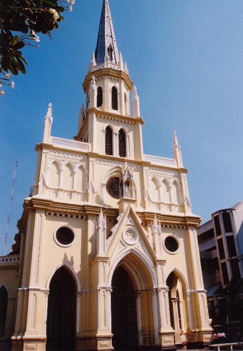 It was fascinating to learn that as late as 1955 the statue was still covered in plaster, cloaked as it had been since the marauding Burmese sacked Ayutthaya. Its treasured core had become a forgotten secret. It was only for the good fortune of hiring clumsy removal men, who dropped it, cracking the plaster revealing the 18 carat gold that otherwise it would have still remained a hidden gem. Near the exit a row of three bells were calling out to me to chime them. I obliged, and gave them each an almighty thwack which felt quite liberating. I donated a few Baht for the opportunity and also as penance for my disrespect of photographing the Golden Buddha. We sat down for a bit, so that Julie could remove her skirt, and apply antiseptic cream on her flea bites. By now they were weeping unattractively and were a source of worry for her. She had visions of a gross worm the length of a bowl of spaghetti growing inside her leg! Whilst it didn't look that bad the bites were still a concern and we promised to keep a close eye on how they developed. We moved on following Charoen Krung Road. I knew that it would lead us to the Royal Orchid Sheraton. In theory it wasn't at all far but the reality of walking down the busy industrial street was quite different. Most of the stores were mechanical workshops with people soldering away, making signs, selling trolley wheels. We were the only tourist stupid enough to be walking down this way. We must have stood out like a shiny throbbing spot on the end of Charoen Krung's nose. Every store owner stopped their work and looked quizzical at these two sweaty crimson tourists stumbling along. Every tuk tuk driver that whizzed by must have thought "Look at those nutters, they must be desperate for a ride outta here" Not one passed us by without screeching to a halt to see if we needed saving! But we carried on regardless. Before too long we turned down Si Phraya road, and could see the Sheraton a short distance away. It was a perfect time for a poolside siesta but first I wanted to pop to the Portuguese Church nearby. |